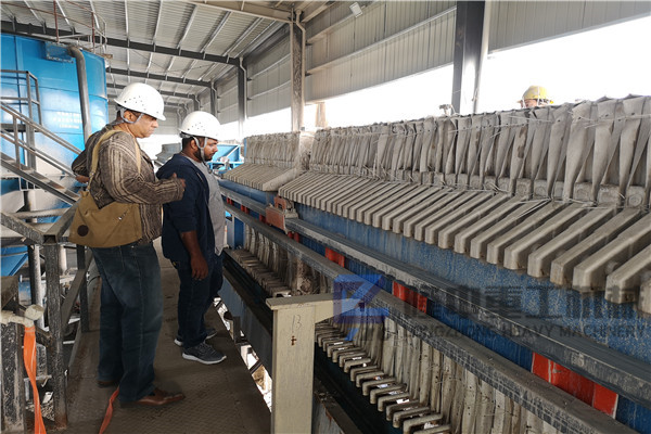 上圖:國外客戶在現(xiàn)場了解隆中壓濾機(jī)