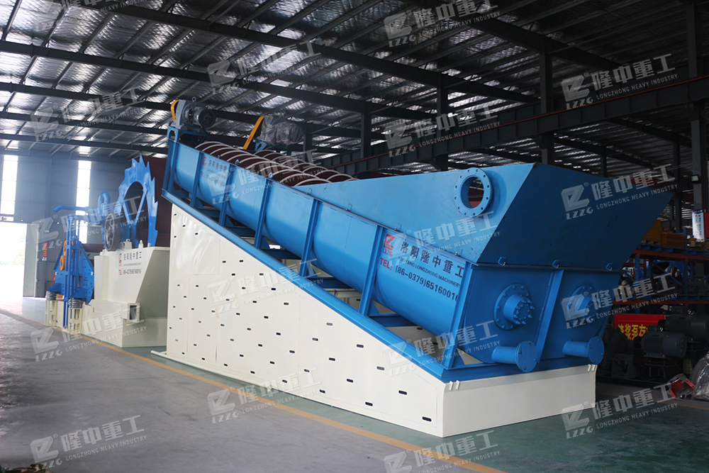 砂石物料經篩分設備分級過濾合格產品通過流槽管道流入螺旋攪拌機,經螺旋攪拌機充分清洗、浸泡、打碎(針對泥性較大) 尾礦水排入一段分離裝置濃縮、分級;尾礦及粗礦同時進入水車進行清洗、脫水,尾礦水排入二段分離裝置濃縮、分級,尾礦及粗礦再次同時進入脫水除泥裝置;經高頻振動電機充分脫水干排成品由成品輸送帶堆放料堆進行出售。